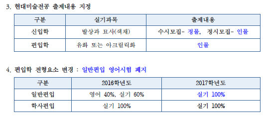 2017학년도 서울여자대학교 미술대학 편입학 변경사항 안내드립니다. 2017학년도 서울여자대학교 미술대학 편입학 변경사항을 안내하오니 미술실기를 준비하는 수험생들은 참고하시기 바랍니다.(모집요강에 명시된 내용에 근거한 세부사항 입니다.) <변경내용> 1. 현대미술전공 출제내용(정물/인물) 지정 2. 편입학 전형요소 변경 이상입니다. |